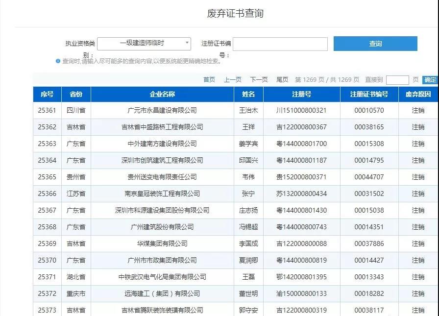 从中国建造师网查询可知,截止2019年7月19日,一级建造师废弃证书数量达到328814本,一级临时造师废弃证书数量达到25369本,废弃原因主要为“遗失、污损、更换、注销、打印错误”。