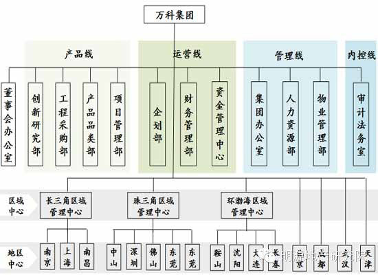 【例】“战略总部、专业区域、一线公司”是万科典型的三级管控架构。除了在战略、品牌、融资、研发和流程上对一线公司支持外,投资、财务和人事3个重要权限仍由总部管控,区域公司仅仅代表总部对下辖的一线公司进行指导和管理。过去总部负责的设计、工程、销售等专业管理职能逐步下放到区域中心。