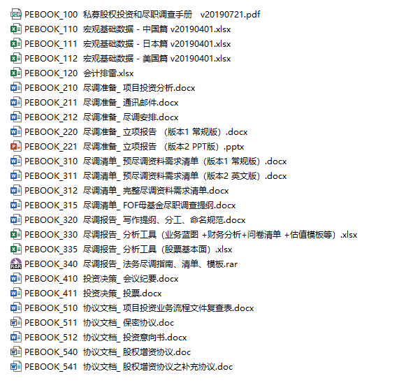 superke7 发表于 2019-7-24 10:24 附件为最新版 《私募股权投资和尽职调查手册》及常用配套工具,除手册外还包括尽调材料清单、尽调报告模板、 ...