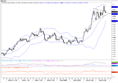 本周四欧洲央行议息,欧洲央行和德拉吉料将发表鸽派言论,因为欧洲央行以前都是一如既往的鸽派,何况是现在美国都准备降息了,而欧洲的经济表现也一般。如果欧元在鸽派讲话影响下大跌,美元继续被动上升,黄金料将回踩1400美元一线,再下一支撑位是前低1380美元。