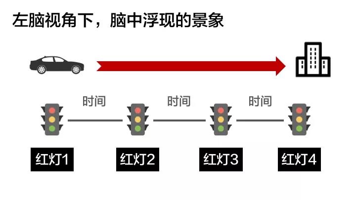 例如早上上班时,百无聊赖的我在等红灯,前面的车大排长队。这时我估算了一下剩下路程中,还有几个红灯需要等待,每个红灯大概会花费多久时间,那么我就能计算出到达公司是几点钟。此时,我开启的是左脑视角(如下图):