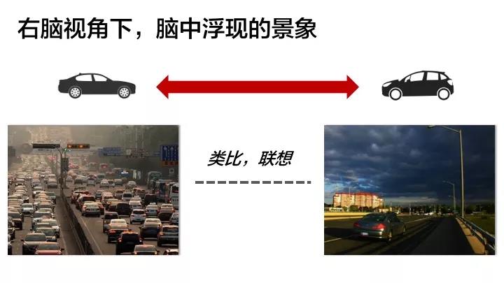 而当我看到眼前堵车的情形,不禁心里开始抱怨,同时联想起以前和朋友去国外旅行,那时我们在一望无际的高速公路上任意驰骋,欣赏着远方的蓝天白云,空气里都弥漫着自由的气息,哪像现在这样困在车水马龙里。此时,我开启的是右脑视角(如下图):