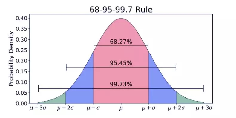 正态分布通常和 68-95-99.7 规则(上图所示)相关: