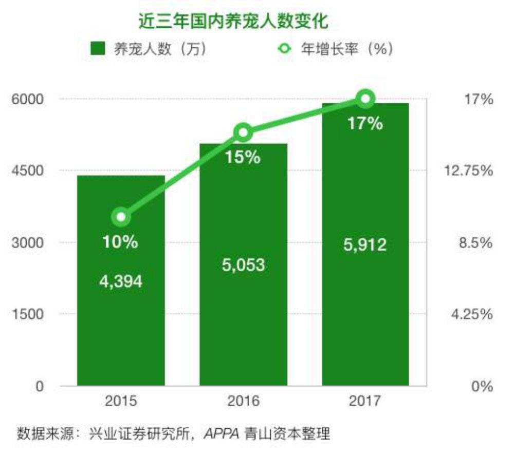 青山资本的投资总监艾笑从2012年就开始关注宠物市场,是国内最早专注于宠物市场的投资人之一,代表项目为pidan和汪仔饭。她对虎嗅表示,“从投资的角度来看,宠物赛道是近几年众多细分消费赛道中增长最快的之一。”根据青山资本的研究,2015年宠物市场已经达到1000亿左右的规模,之后每年以30%~40%的速度增长。2019年最新数据显示,宠物市场的整体规模已经接近2000亿。“中国的宠物猫狗的数量,实际上已经超过了很多发达国家的人口数量。”