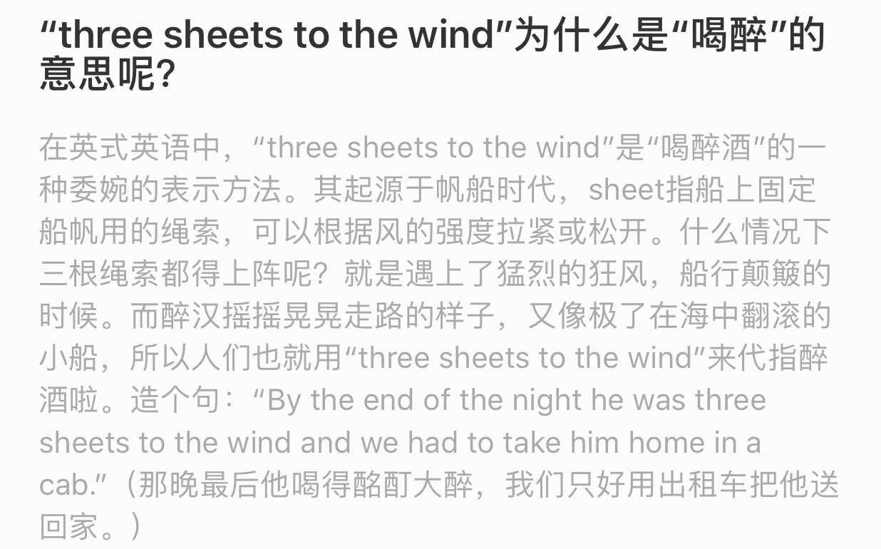 three sheets to the wind 三根绳索遇上猛烈的风,船行颠簸就像醉汉走路,所以代指酩酊大醉