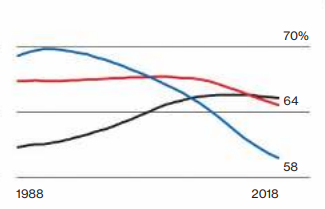 One theory is that demographic forces ⑥ willkeep inflation and rates permanently low. Europeis thought to be going through a process that’salready played out in Japan—as populations get olderand the share of working-age people falls, theremay be too little consumer demand pushing pricesup. Meanwhile, pension funds are willing to payup for long-dated bonds—and accept low yields—to match their increased retirement liabilities.