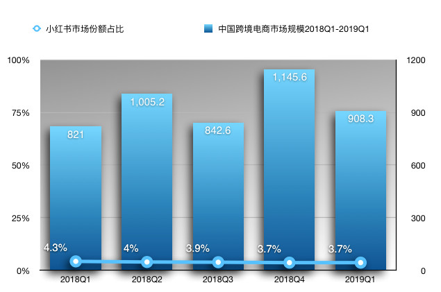 图2 2018Q1-2019Q1中国跨境电商市场规模与小红书市场份额占比(数据来源:易观)
