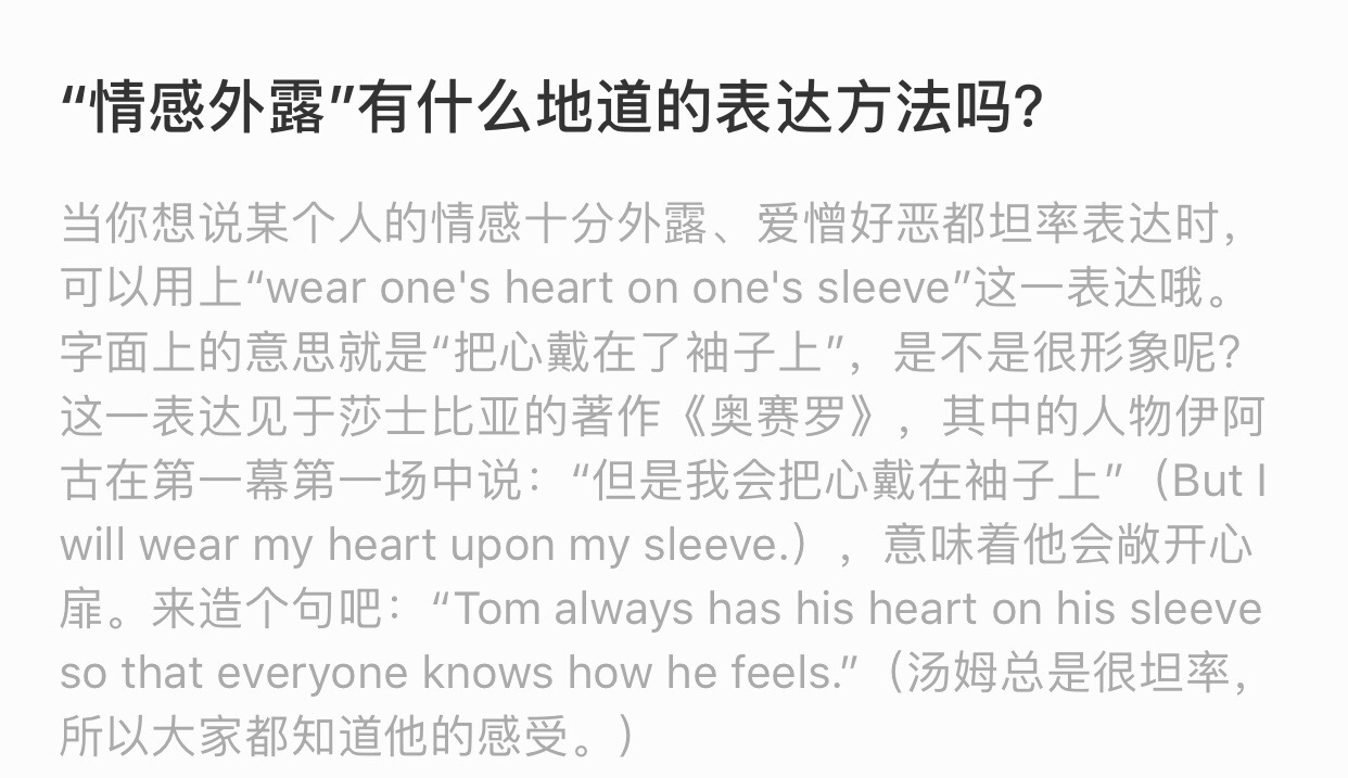 【学习笔记】1.情感外露/敞开心扉:wear one‘s heart on one’s sleeve 2.今 ...