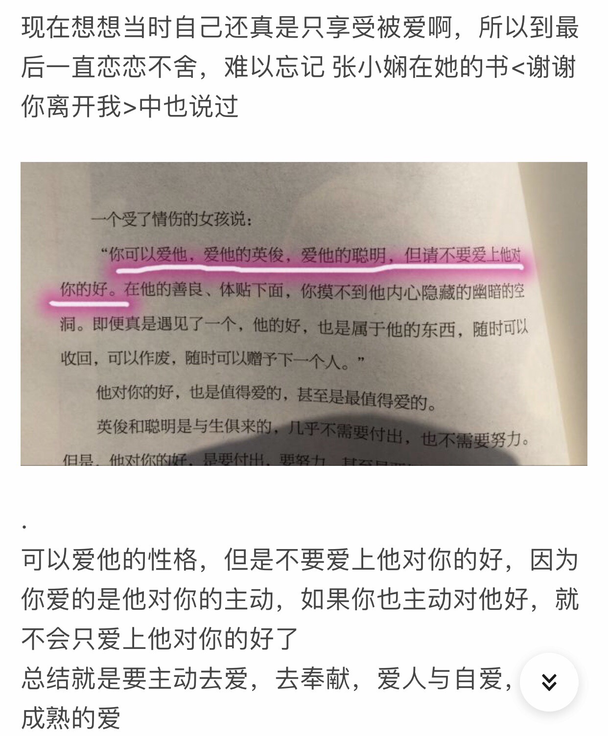 2.今天终于看完了艾里希·弗洛姆《爱的艺术》:童稚的爱遵循“我因被爱而爱”,“我爱你,因为我需要你”;成熟的爱遵循“我因爱而被爱”,”我需要你,因为我爱你”