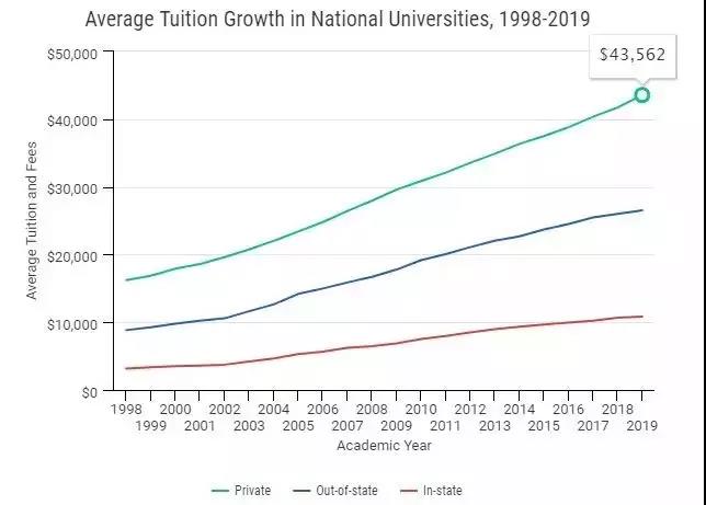 在过去20年里,美国四年制私立大学平均学费上涨了168%,公立大学州外学生学费上涨了200%;公立大学州内学生学费增长了243%。