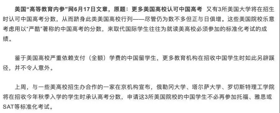 图为今年6月,美国高等教育内参网发表的文章,俄勒冈大学、塔尔萨大学、罗切斯特理工学院将在招收今年秋季入学的学生时承认高考分数,申请这3所美国院校的中国学生不必再参加托福、雅思或SAT等标准化考试。