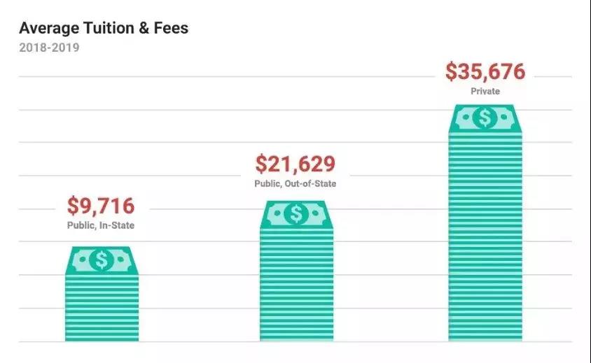 U.S. News对近2000所美国大学的统计显示,2018-2019年学费平均上涨3%。在737所私立大学中,超过100所院校本学年学费5万美元以上。私立大学2018-2019年学费平均35,676美元,公立大学本州学生学费平均9,716美元,公立大学州外学生21,629美元。