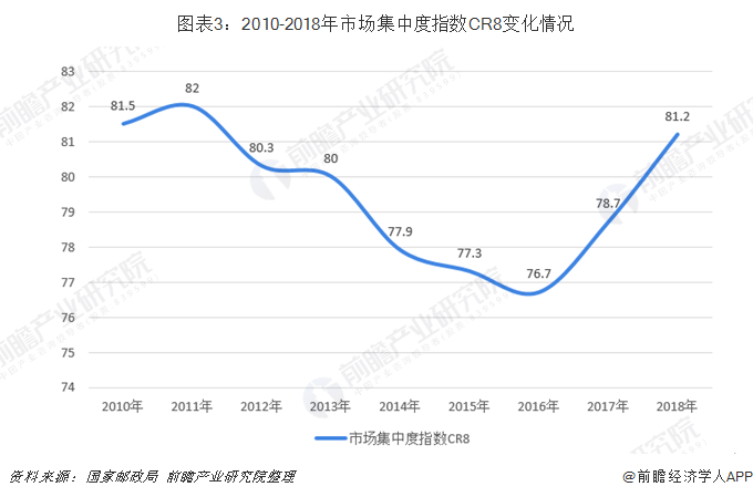 市场集中度加速提升。2018年,快递与包服务品牌集中度指数CR3为81.2,同比提高2.5。市场集中度指数CR8在上年反弹后呈现加速提升的态势,提升幅度创历年新高,行业规模经济效应更加显著。我国已形成1家年营业收入超千亿元、5家超500亿元的快递企业集群。