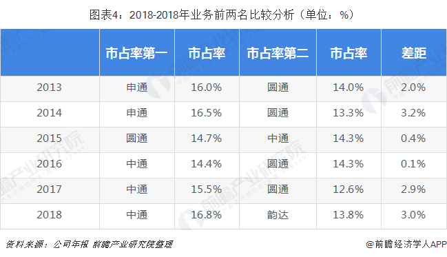 在具体企业层面,2014年之前申通十年王者,2015年圆通取而代之,2016-18年的中通三连冠,同时18年韵达从通达系小弟追至榜眼,百世超越了申通。2018年,中通市占率16.8%、韵达市占率13.8%、圆通13.1%,申通10.1%、百世10.8%。2019Q1,中通市占率18.6%、韵达14.7%、圆通13.6%、申通10.5%、百世11%。通达系市占率达到57.5%,加百世CR6达到了68.5%