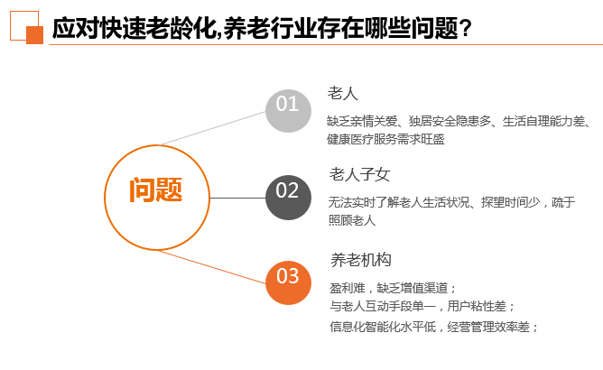 随着中国人口老化速度加快、规模不断扩大的情况下,養老机构在应对快速老龄化,养老行业存在哪些问题?第一:老人缺乏亲情关爱、独居安全隐患多、生活自理能力差、健康医疗服务需求旺盛;第二,老人子女无法实时了解老人生活状况、探望时间少,疏于照顾老人养老第三,机构盈利难,缺乏增值渠道;与老人互动手段单一,用户粘性差;信息化智能化水平低,经营管理效率差;