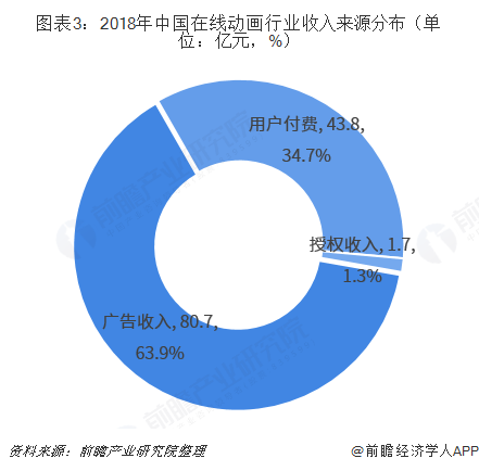 更具体的,从在线动画市场规模细分来源来看,广告仍是第一大收入来源。2018年,在线动画行业来自广告、用户付费和授权的收入占比分别为63.9%、34.7%和1.3%。显然,目前在线动画行业授权收入仍处于非常低的水平,未来随着我国对产权保护重视度的不断提高,授权收入有望得到提升。