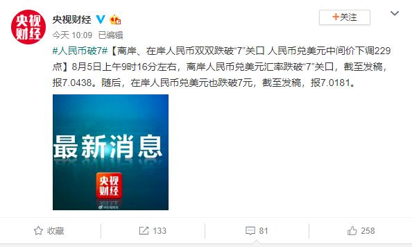 今天上午9点16分左右,离岸人民币兑美元的汇率跌破7关口。随后,在岸人民币兑美元的汇率也跌破7元,创下了11年来的最低点。针对这一情况,央行也快速作出回应:人民币对一篮子货币继续保持稳定和强势,这是市场供求和国际汇市波动的反映。人民币资产的估值仍然偏低,中国有望成为全球资金的"洼地"。