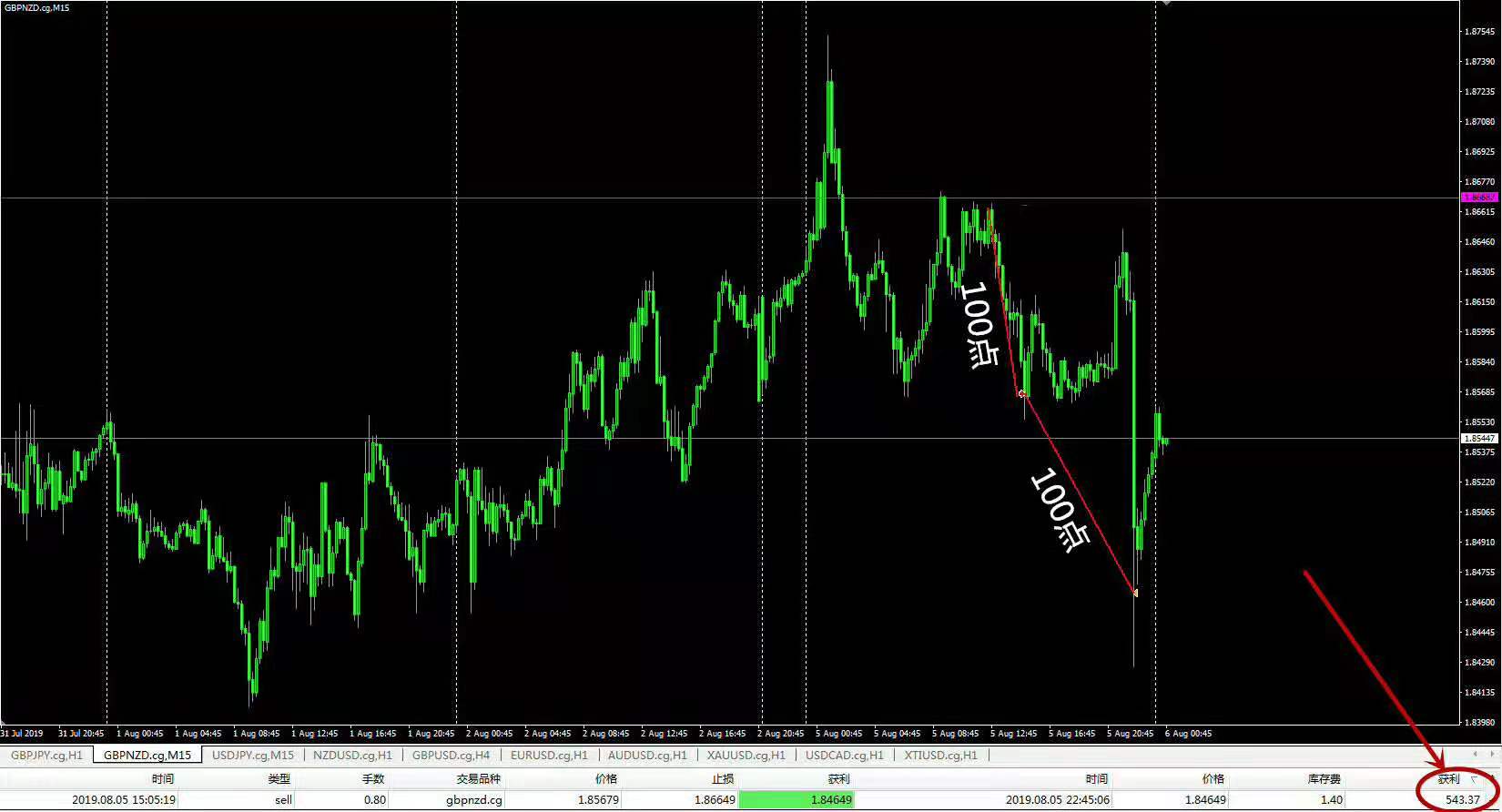 止盈100点出场,本次盈利543美金,折合3800人名币