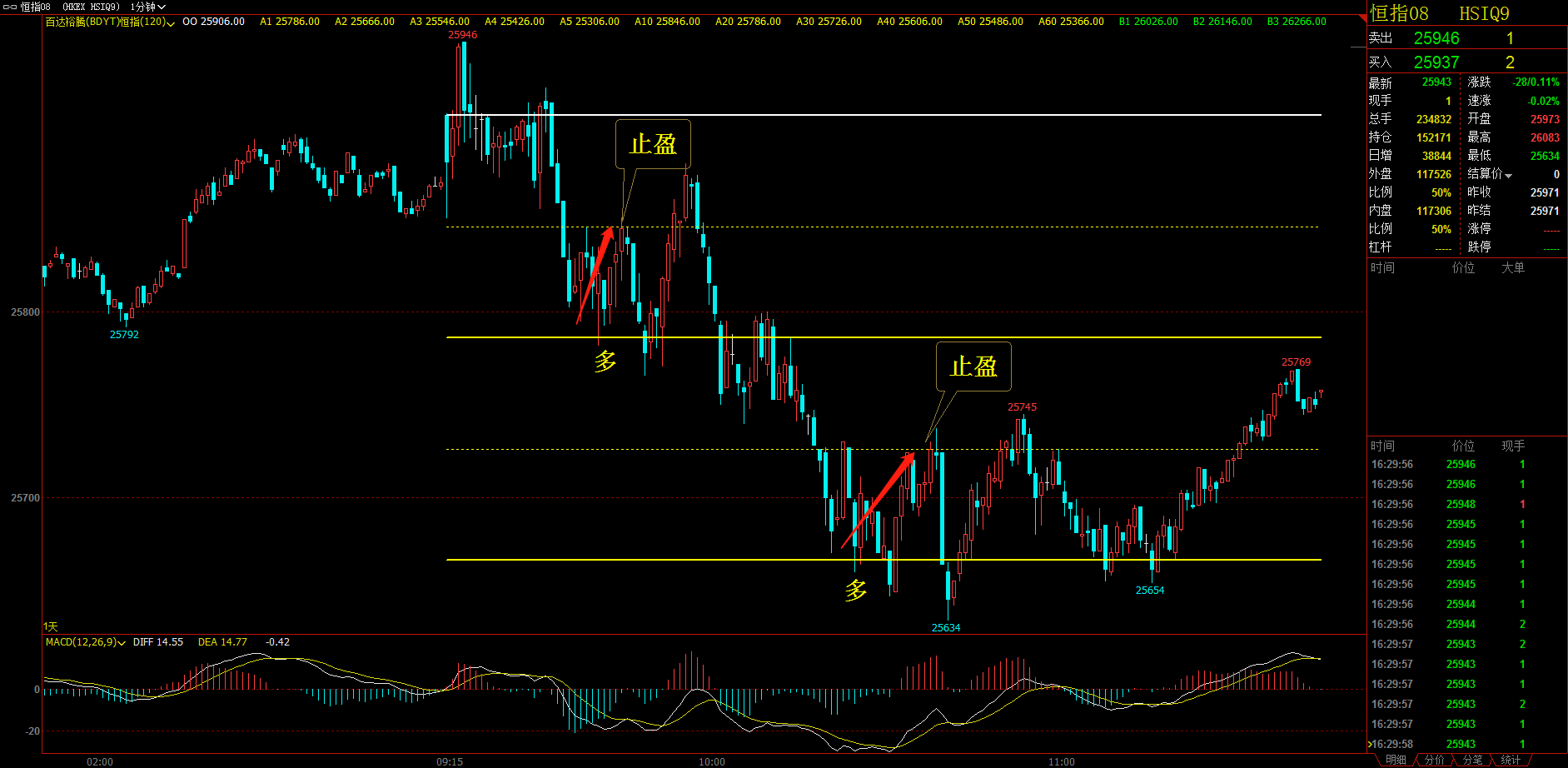 [backcolor=rgba(255, 255, 255, 0.7)]1、系统提示多单信号形成,25786开仓多单一手,止盈,平仓价25846,获利3000港币。