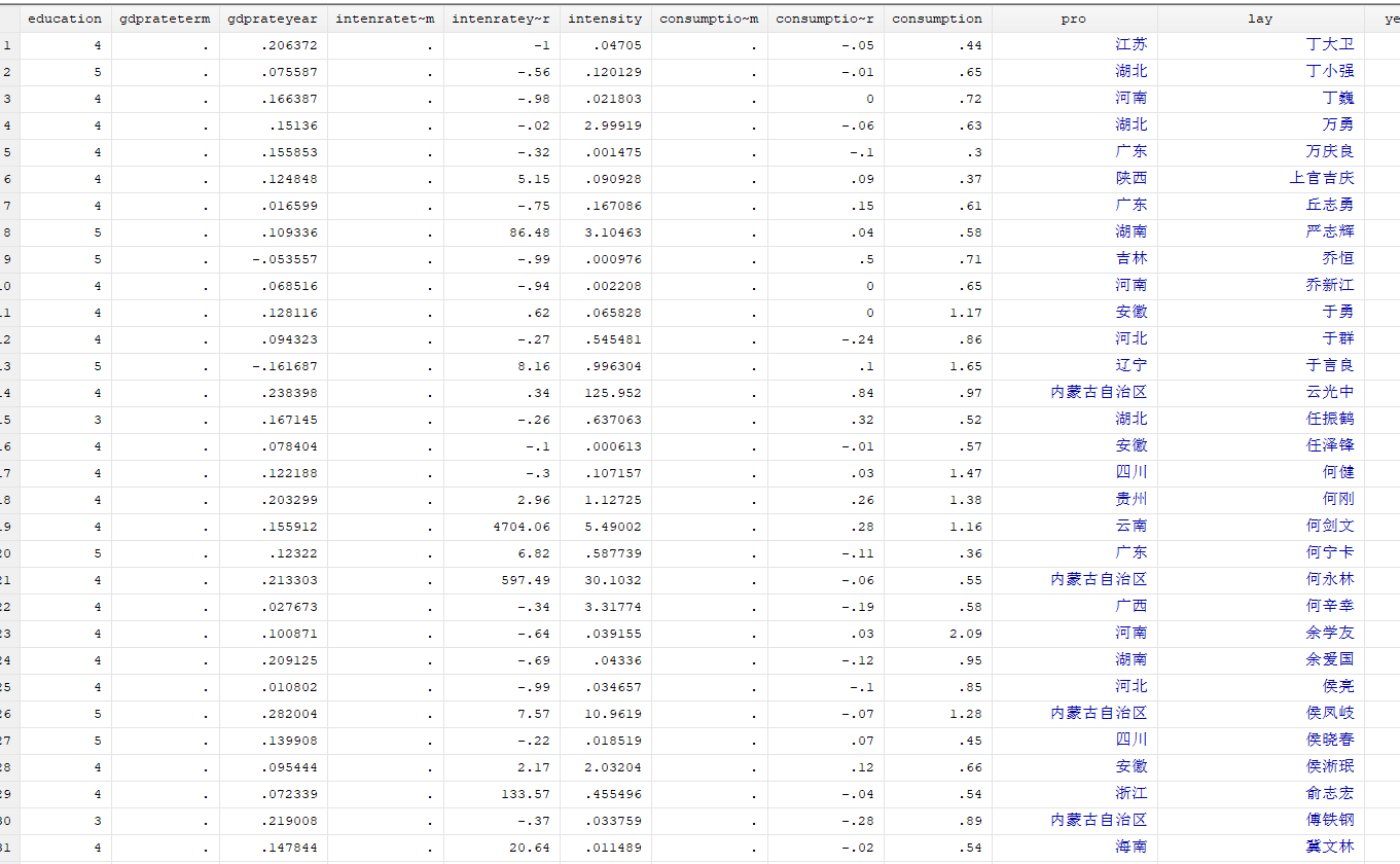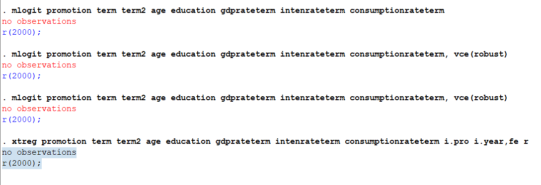 各位朋友好,我在用做多项logit模型做官员晋升影响因素的归回,是面板数据,希望固定年(yaer)效应与省(pro)效应。操作过程中,一直出现如下图问题“no observations r(2000); ”,请教一下我这是出了什么问题。另外,回归和固定效应之间的操作顺序,在回归中控制变量与使用固定效应之间的关系,我也比较迷糊,希望请教一下。(目前在看陈强老师的stata应用第2版)