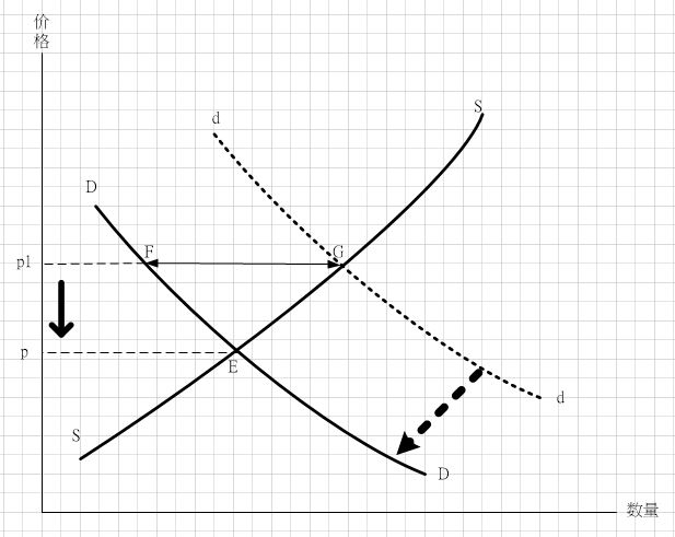 我有解释;p1有可能是先前的均衡价格,G点是旧均衡。景气不好,买方所得下降,需求线左移到DD线,均衡点移 ...