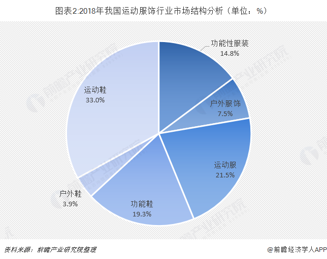 从2018年我国运动服饰的细分市场来看,运动鞋和运动服为两个最大的细分市场,这两个市场的零售额总共实现1445亿元,市场份额占比合计为54.5%。