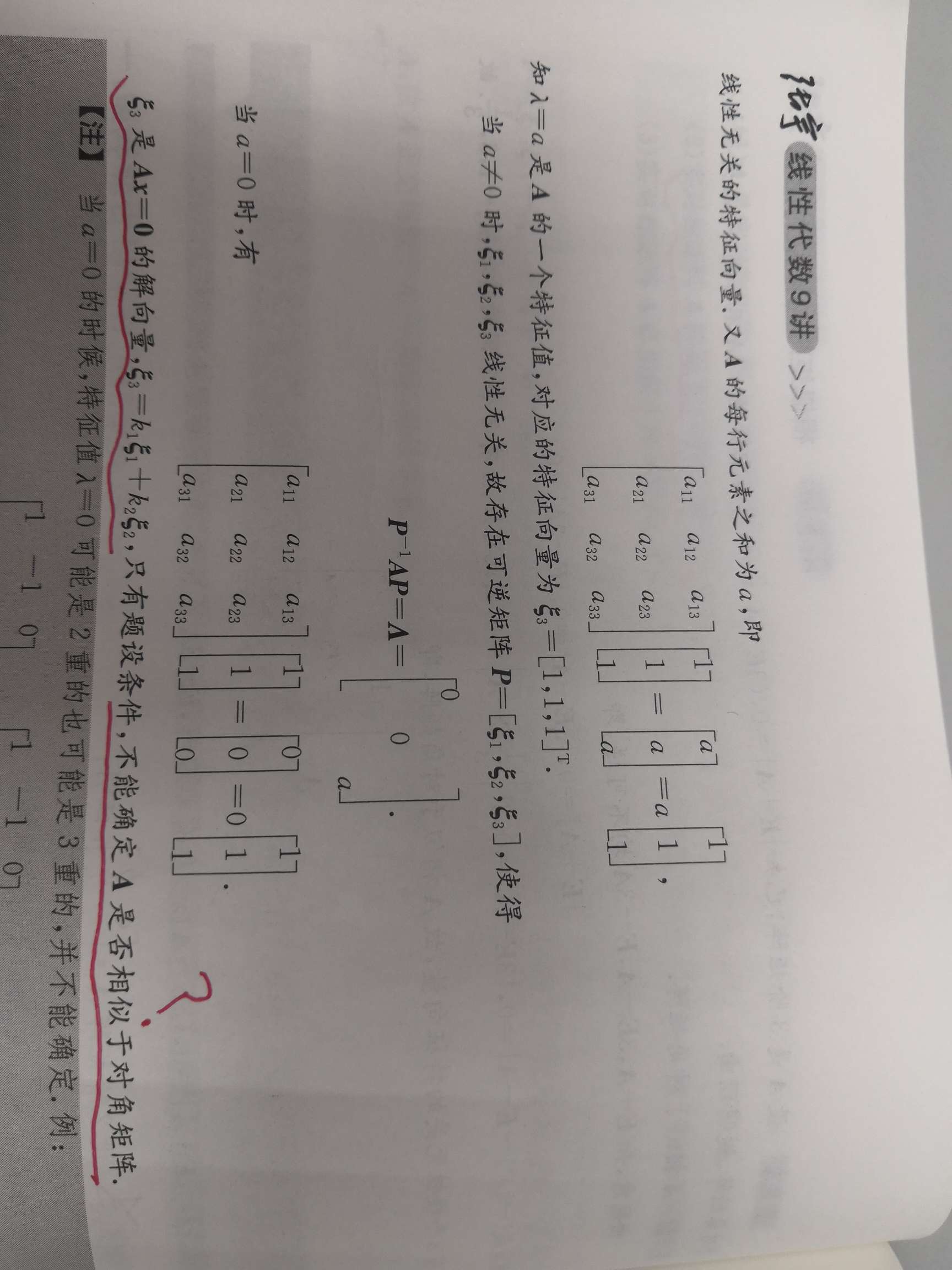 Ax=0的基础解系只有两个向量,a=0时,A的三个特征值均为0,那线性无关的特征向量只有两个吧?小于3,那么可以确定A不相似于对角矩阵吗