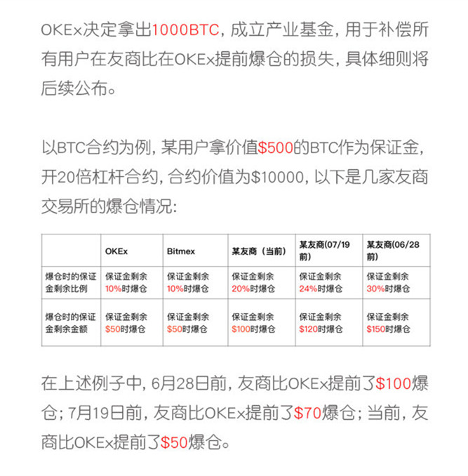 随后,ok又公布了新公告,关于“OKEx决定拿出1000BTC,用来补偿所有用户在友商比在OKEx提前爆仓的损失”的具体细则,看来这次是来真的了!!!
