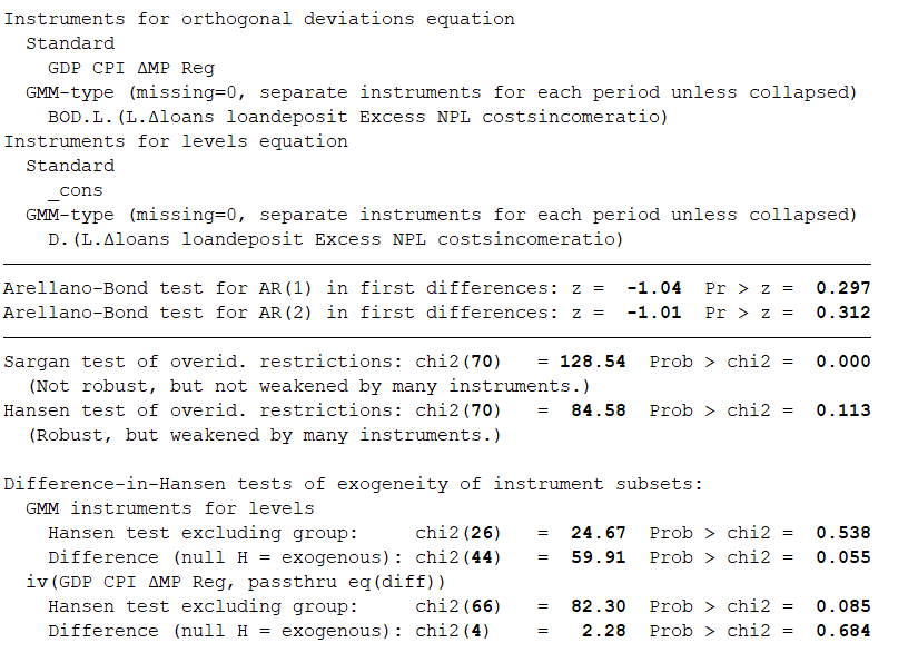 code: xtabond2 Δloans l.Δloans Excess ΔMP_Excess Excess_GDP ΔMP_IR Reg ΔMP Δassets ΔROA loandeposit GDP CPI costsincomeratio ,gmm(l.Δloans loandeposit Excess NPL costsincomeratio,orthogonal lag(1 1))iv(GDP CPI ΔMP Reg ,p eq(diff) )twostep robust small orthogonal h(2)