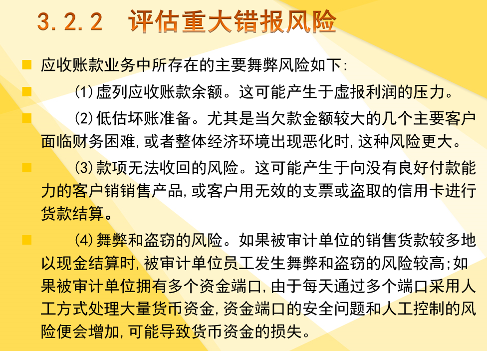通过学习,掌握销售与收款循环的重大错报风险评估以及控制测试,掌握主营业务收入、应收账款、其他应收款、坏账准备等项目审计的实质性程序。