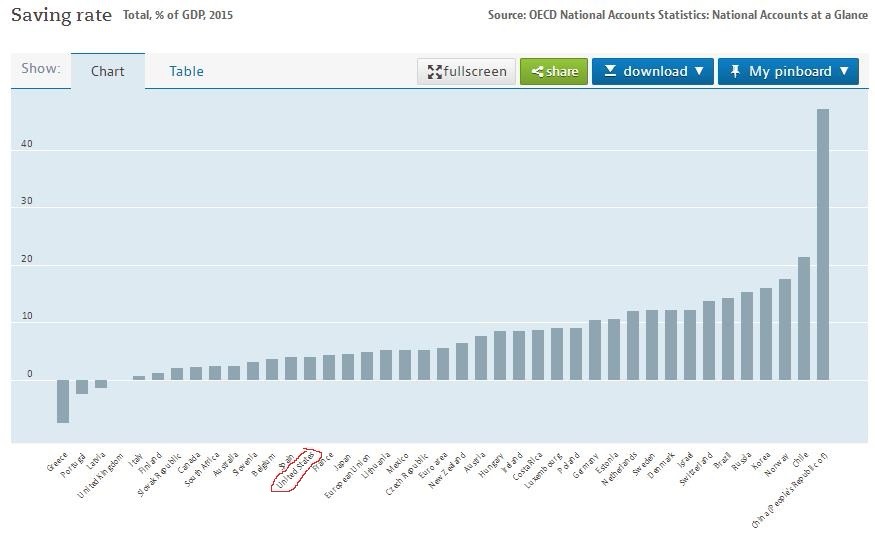 美国拥有巨额贸易逆差的原因在于美国的储蓄率低。根据OECD发布的数据