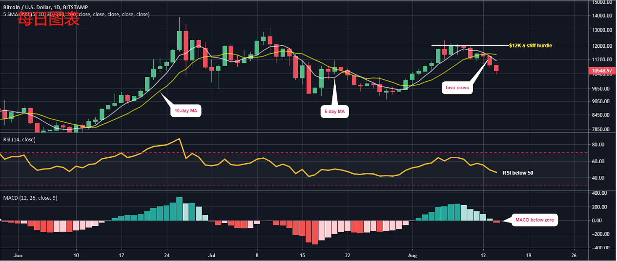 比特币出现在轨道上以测试10,000美元的心理支撑位,因为日线图移动平均线和其他关键指标已经转为看跌。小时图上的大量价格细分也有利于跌至10,000美元。然而,小时图指标报告看涨背离。因此,价格反弹至10,700美元之前可能会跌至10,000美元。如果价格收盘价在12,000美元以上,则日线图的前景将转为看涨。比特币(BTC)在截至8月6日的10天内回撤了3000美元涨幅的50%以上。按市值计算的最高加密货币目前在Bitstamp上的交易价格为10,500美元,当天亏损6%。按目前的价格计算,从7月28日的低点91111美元到8月6日高点12,325美元的反弹中,大约有53%被淘汰。
