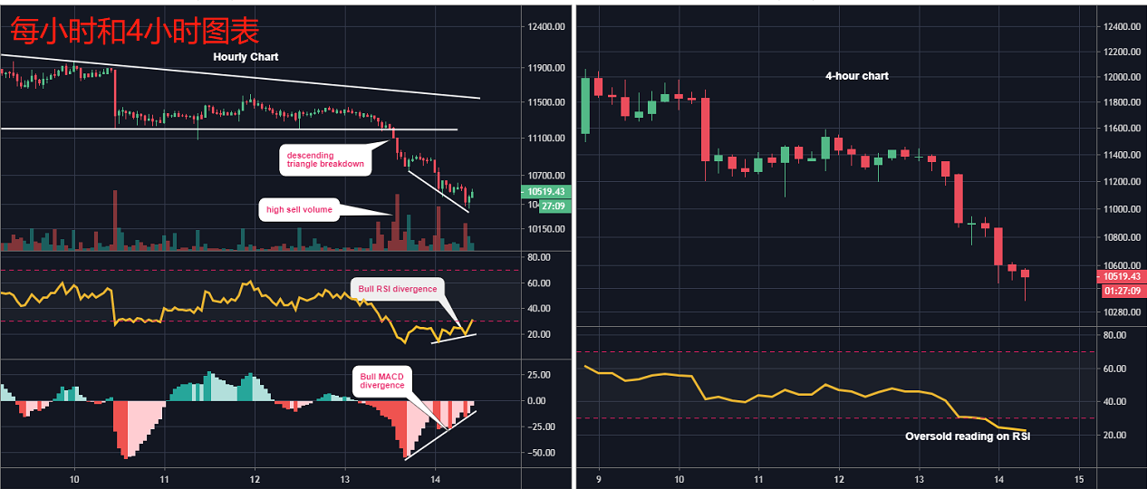 从每日图表可以看到,5天和10天移动平均线的看跌交叉点和相对强弱指数(RSI)低于50的读数表明阻力最小的路径是下行路径。移动平均收敛分歧(MACD)柱状图也已经越过零线,证实了看涨转向看跌的趋势变化。因此,加密货币看起来将测试10,000美元关卡。如果价格收盘接近12,000美元以上,前景才会转为看涨。该水平在截至8月10日的六天内表现出强劲阻力。在每小时和4小时图表中,小时图中的大量下降三角形破裂表明卖家处于控制之中。然而,RSI和MACD均在小时图上创出更高的低点,与价格的低点相矛盾。关键指标的看涨背离表明价格反弹的可能性,可能是10,700美元的阻力。破位将会逼近11,000美元。4小时相对强弱指数的超卖数据也显示盘中复苏反弹的空间。