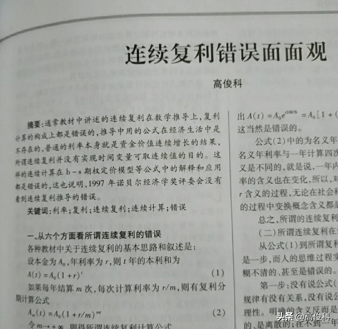 三 关于这个问题,我 1988年就有发表在《数学的实践与认识》上的文章《关于所谓增长率的连续计算问题》,第一次分析连续复利公式的错误,1998年、2018年都有文章再论述这个问题,去年发表在《金融经济》上的文章《连续复利错误面面观》,文章摘要中就指出“1997年诺贝尔经济学奖评委会没有看到连续复利的错误”。也就是说,这结论被多家杂志社认可的。