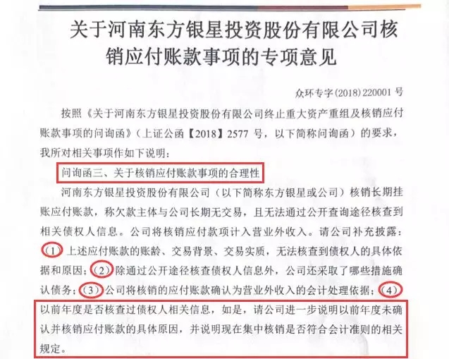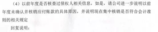 我们来看一个上市公司因核销长期挂账的应付账款被问询的案例,问询函中也关注到了这一个问题:(4)以前年度是否核查过债权人的相关信息,如是,请公司进一步说明以前年度未确认并核销应付账款的具体原因……