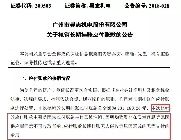 案例四:广州市昊志机电股份有限公司核销应付账款23.12万元。
