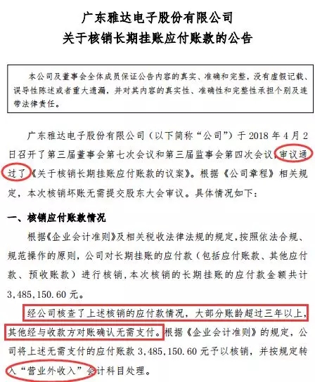 案例六:广东雅达电子股份有限公司核销应付账款348.52万元。