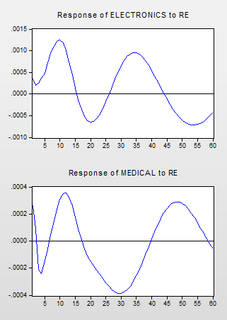 Eviews在做脉冲响应图,做出来的结果是曲线围绕横轴上下波动,这种情况要怎么解释,求大神帮帮忙?ps:我在做Granger因果检验时这两个变量也不显著。