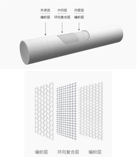 目前国内玻璃纤维复合材料管道生产行业的工艺多为定长交叉缠绕工艺。项目通过自主研发专业设备,实现应用编织编绕拉挤工艺,并实现制程全自动化生产。所生产的管道内外层为编织层,中间层为具有无限长纵向及编绕环向,通过高精度内外模具高温固化,生产出来的管道具有重量轻、环刚度高、柔性好等特点。此工艺应用相对于传统工艺的产品密度提高了35%。