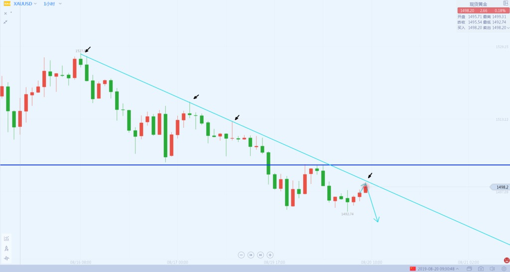 1:黄金见1499直接做空,防守1504,目标看前期低点1488。