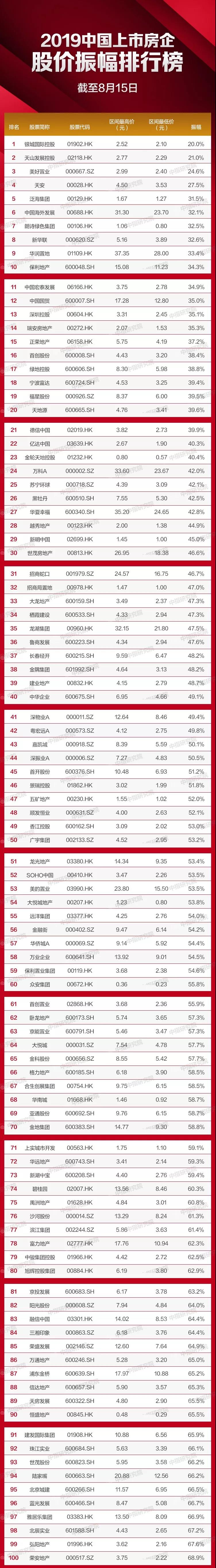 股市在经历2018年的寒冬后,于2019年迎来回弹,整个上半年大盘都在震荡回升。伴随着中央及地方两会房地产市场调控基调“以稳为主,一城一策”的确定,大部分地区调控政策仍以稳定为主,同时信贷环境略有改善、融资压力不减、房企2019上半年业绩保持稳定增长,优质地产股受到追捧,股价持续波动上涨。在此背景下,中指研究院对上市房企股价振幅情况进行研究,关注房企在资本市场的最新动态与热点,为投资者找出具有投资价值的房地产公司提供参考。