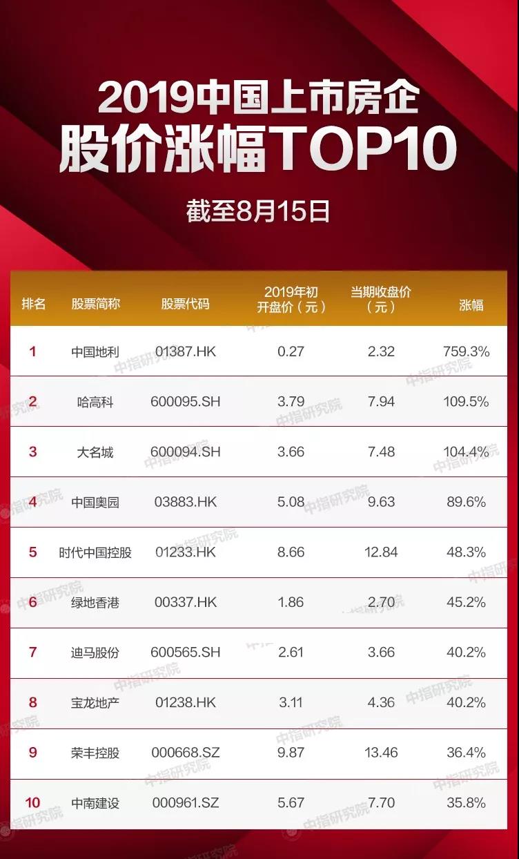 说明:数据来源为公开资料,最终解释权归中指研究院所有;时间节点为2019年1月1日-2019年8月15日;样本范围为内房股和A股上市房企,并剔除部分ST及业务转型的企业。