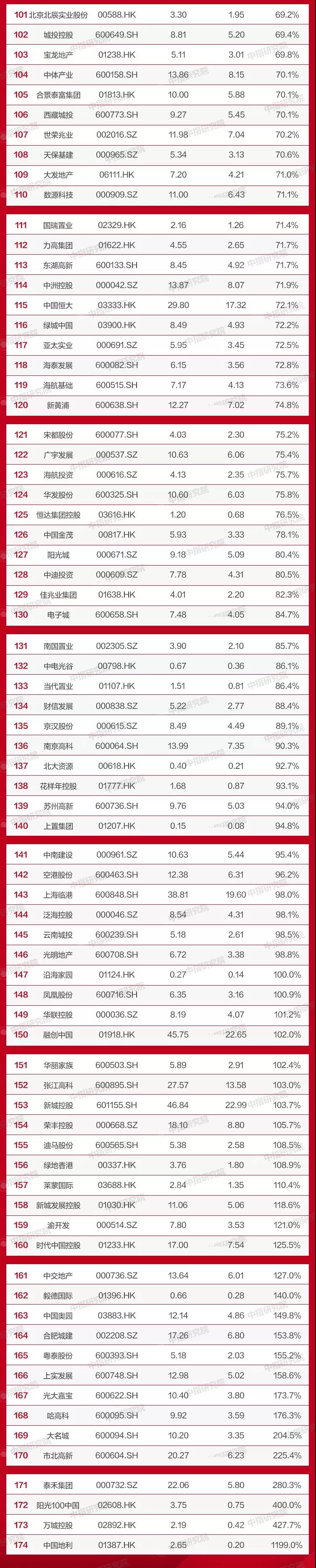从整体来看,房企在资本市场活跃度更高,振幅高于沪深300与恒生指数。174家企业中,28家振幅在100%以上,132家振幅在50%以上。部分中小房企由于布局、产品、资金受限,更容易受到市场波动影响,振幅相对较大。振幅较大的企业投资回报较高,更易吸引投资者关注。但仍需注意的是,较高的回报伴随较高的风险,投资者在关注企业回报率的同时仍应注意企业的潜在风险,并及时采取措施规避。