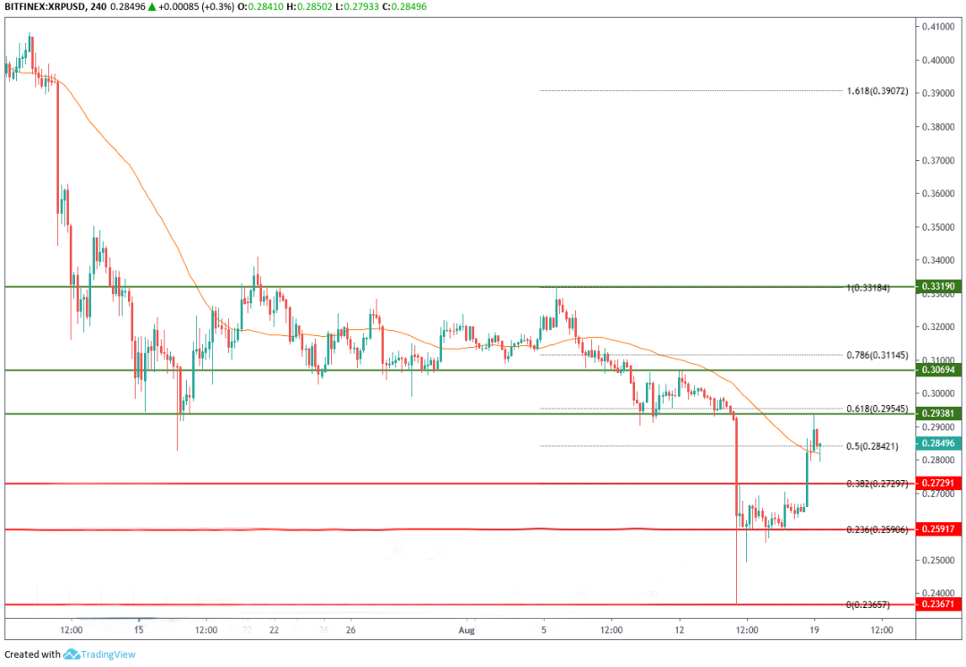 XRP 的涨幅主要出现在周日(8月18日)。CoinMarketCap 行情显示,整个周末期间(17日-18日),XRP 收报0.29美元,涨幅9%,领涨其他币种。然而, XRP 周末短线反弹仅仅是重新回到了过去一个月左右弱势震荡所处平台下沿附近,并未能真正实现对于0.30整数一线的重新收复。