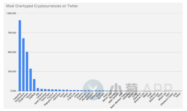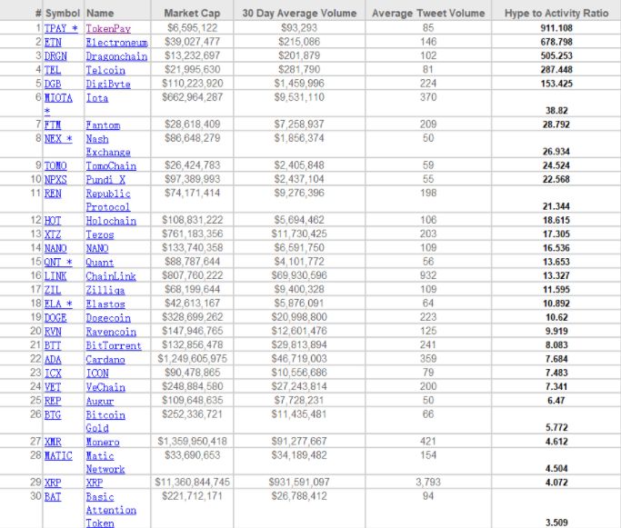 The Tie.io 创建了一个炒作活动比率指标(Hype-to Activity Ratio),测量了每个币种每100万美元交易量的推文量。就像操纵交易量一样,很多加密货币同样在Twitter上被大量的机器人账户、虚假追随者操纵。