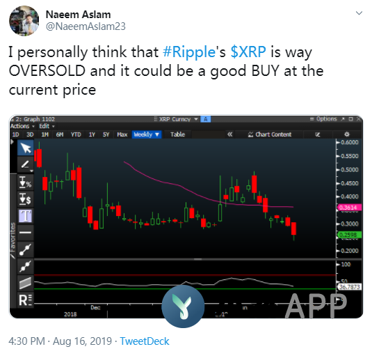 周末,分析师也把目光聚焦在XRP上。8月16日,Think Markets 首席市场分析师 Naeem Aslam 近期发推称,个人认为 XRP 已经超卖,以当前价格买进可能是个好主意。