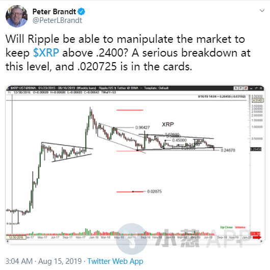在币价上,加密货币分析师 Peter Brandt 日前在推特上表示,一旦XRP出现在 0.2400 美元区域,Ripple 的“成败”时刻就会到来。尽管Brandt 认为 Ripple 是一家“管理良好”的公司,但他坚持认为,Ripple 操纵了 XRP 的价格。