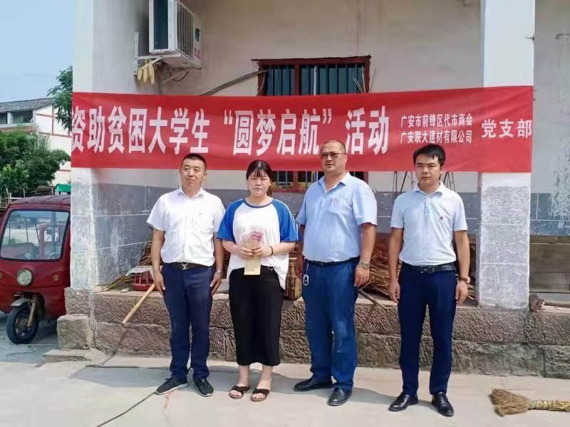(王文华 邓友发)8月21日,四川省广安市前锋区代市商会党支部组织爱心企业广安联大建材有限公司与前锋区虎城镇洪桥村贫困大学生王某某承诺总金额为25000元的5年爱心助学协议,钱虽然不多,但对于王某某一家来说,犹如一场及时雨。