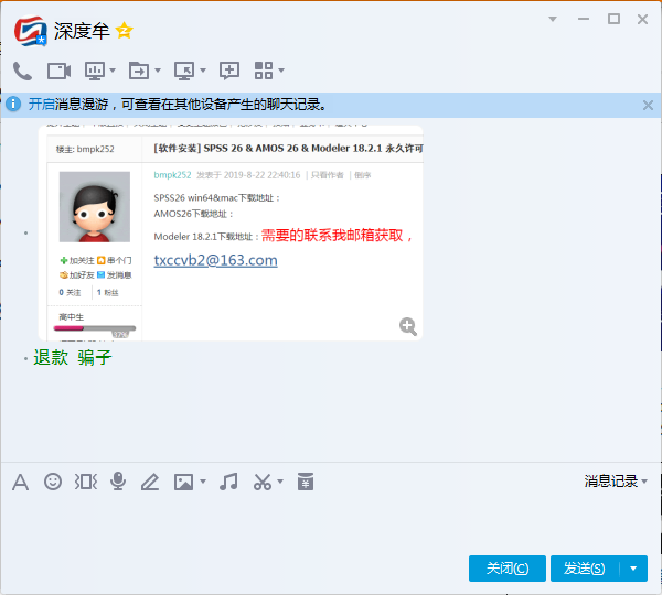 bmpk252 发表于 2019-8-22 22:40 SPSS26 win64&mac下载地址: AMOS26下载地址: Modeler 18.2.1下载地址:需要的联系我邮箱获取,txccvb2@ ...