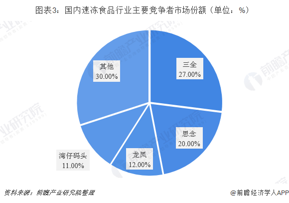 目前,国内速冻食品业三全、思念、龙凤、湾仔码头等四家公司市场占有率达70%。其中三全食品市场占有率已经达到27%,后三者的分别为20%、12%和11%。
